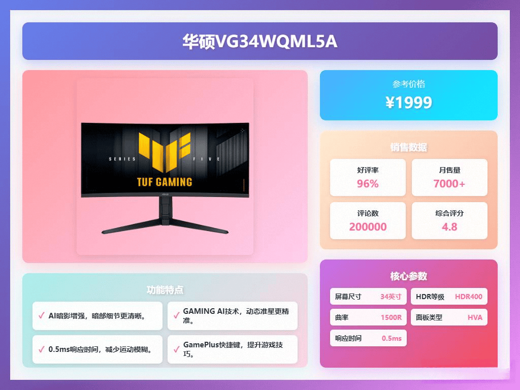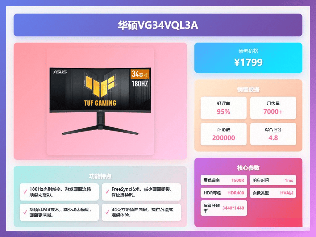 华硕这款显示器采用34英寸的曲面带鱼屏,分辨率达到了2K WQHD级别,画面清晰度足够出色。而且,250Hz的高刷新率和0.5ms的响应时间,玩游戏时流畅度极佳,再也不用担心拖影的问题了!