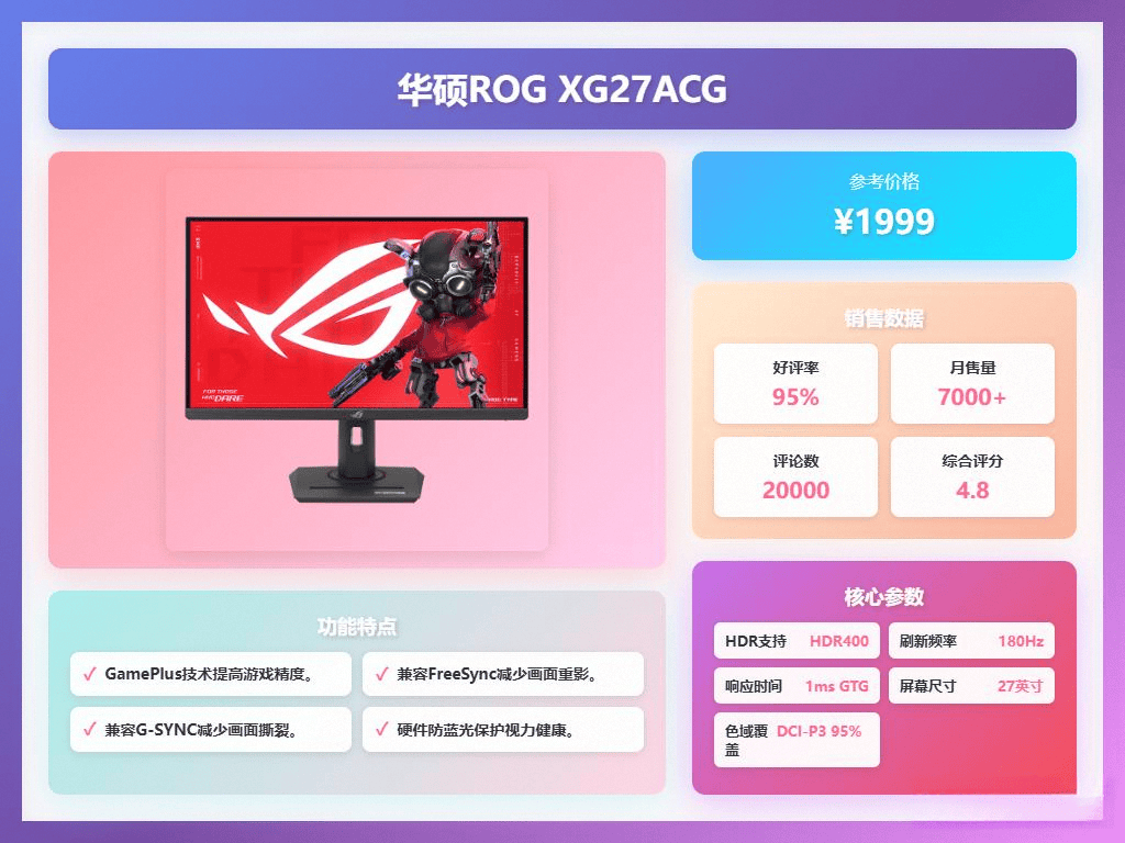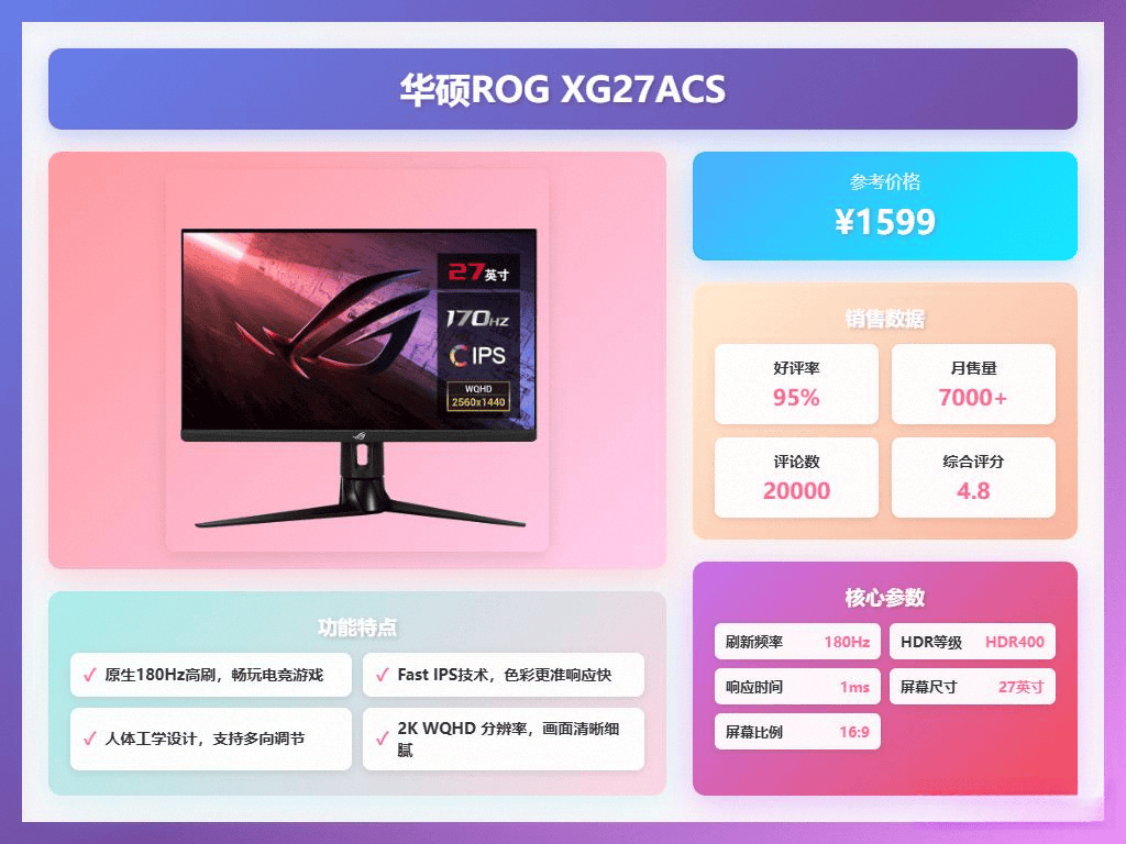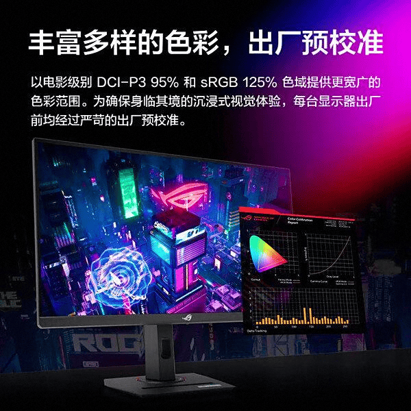 华硕这款XG27ACG电竞显示器,色彩表现力确实不错,支持DCI-P3 95%和sRGB 125%色域,画面色彩更鲜艳。2K分辨率搭配27英寸屏幕,细节也足够清晰。而且它还通过了TUV爱眼认证,长时间使用也能呵护眼睛。