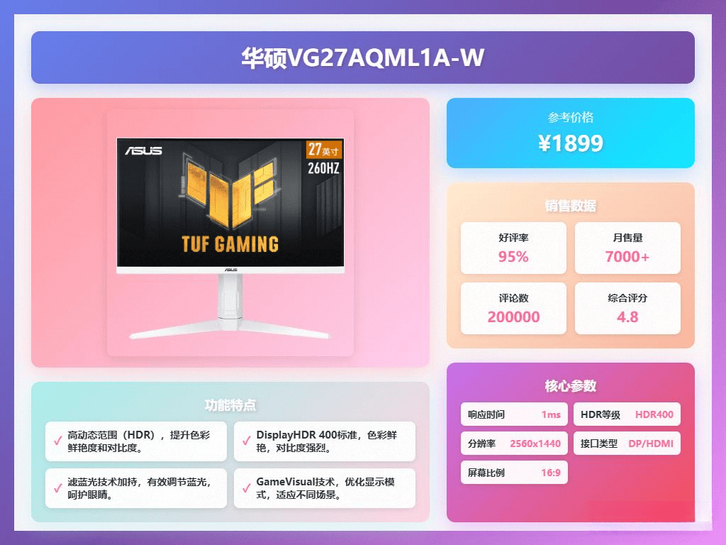 华硕这款显示器,27英寸2K分辨率,画面相当细腻。作为电竞显示器,240Hz高刷新率必须安排上,还能超频到260Hz,搭配0.3ms响应时间,这游戏体验,谁用谁知道!再加上G-SYNC技术,告别画面撕裂,玩起来更带劲!