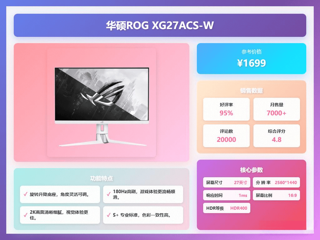 华硕XG27ACS这款显示器,色彩表现力线色域,画面细节也更丰富。27英寸的大小也刚刚好,玩游戏、看电影都很舒服,用它来提升影音体验准没错。